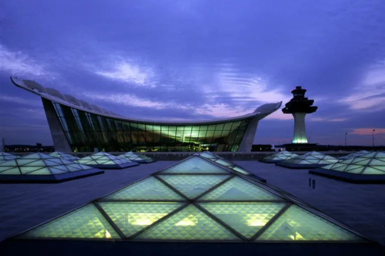 Washington Dulles International Airport is known for its iconic mid-century design, particularly its distinctive curved roof. It also features a unique transport system using mobile lounges, which ferry passengers between different parts of the airport.