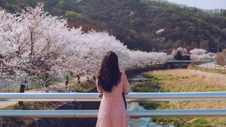 Jangjeon-ri features a dense 250-meter cherry blossom tunnel. It is particularly famous for its night views; when the streetlights turn on, the blossoms glow against the dark sky, creating a magical atmosphere.