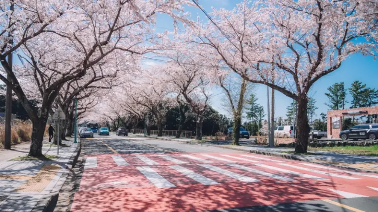 Located in downtown Jeju City, Jeonnong-ro is the island’s most famous cherry blossom street. It features a stunning 1.2-kilometer-long tunnel of King Cherry trees. During the festival, the road is closed to cars, allowing you to walk freely under red and blue lanterns.