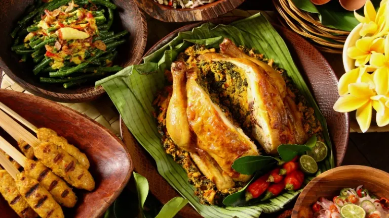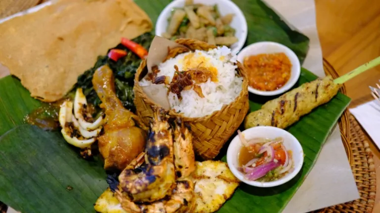 Nasi Campur is the true soul of Balinese food. One plate usually gets you fluffy rice, ayam betutu, sate lilit (minced satay), sambal matah, fried peanuts, and urap (veggie salad).