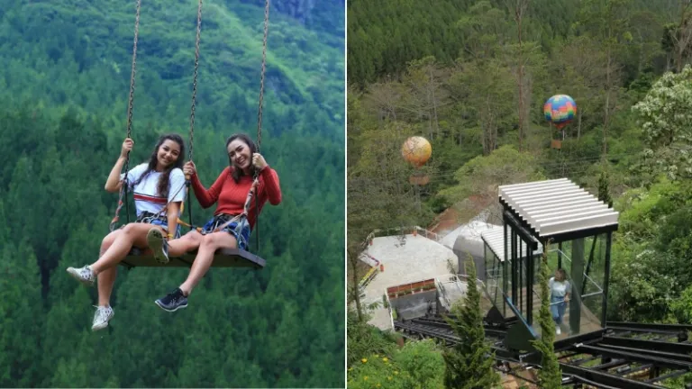 As a pioneer of "altitude tourism" in Bandung, The Lodge Maribaya remains a top destination for those who love breathtaking scenery. It is famous for its sky-high photo spots, including the Sky Swing, Zip Bike, and static Hot Air Balloons that look like they are floating over the pine canopy. For a more relaxed view, you can take the funicular and admire the rolling green hills from above.