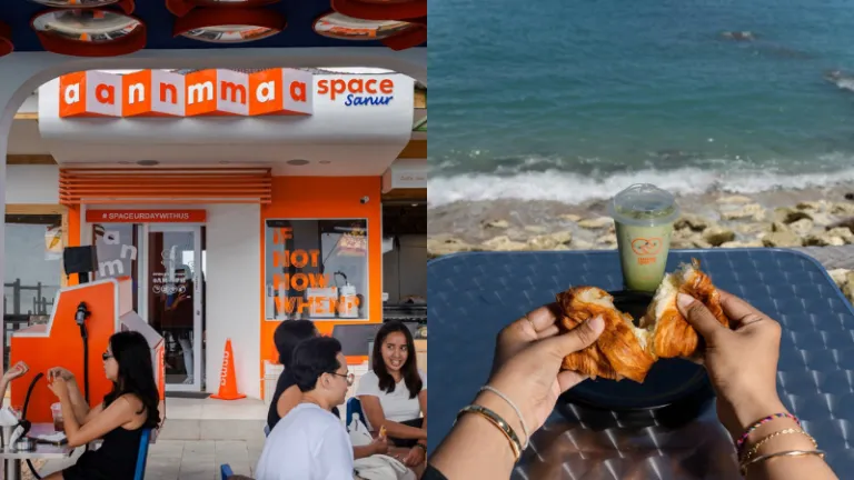 From the outside, this cafe catches the eye with its bold orange and white architectural design. But the real magic happens when you step inside—you are immediately greeted by the stunning view of Sanur Beach. It’s the perfect spot to unwind with a cup of coffee and their delicious signature pastries.