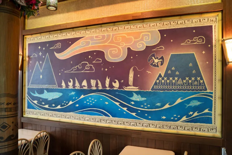 Inside, every detail reflects Moana’s journey as a wayfinder. The ceiling murals and wall art highlight ancient navigation techniques like reading the stars, studying ocean swells, and observing birds and winds. Even the exterior gable is adorned with a stunning depiction of Motufetū, a celestial navigation icon that connects powerful architecture with the timeless art of storytelling.