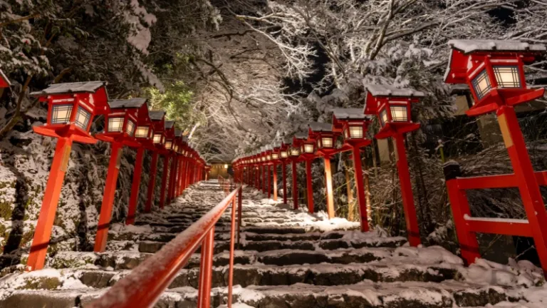 Stepping into Kifune Shrine feels like walking into a storybook. This shrine is famous for its iconic stone steps lined with vermilion wooden lantern posts. In winter, the scene becomes otherworldly as thick snow covers the surrounding trees and the stone path, creating a striking contrast against the red lanterns which are illuminated at night.