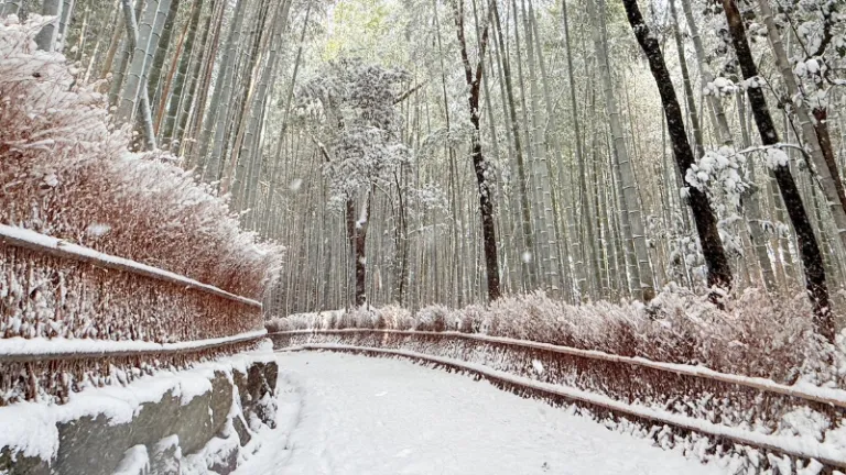 A trip to Kyoto is incomplete without visiting Arashiyama. This iconic bamboo grove features towering green stalks that create a natural tunnel. In winter, the scenery becomes incredibly romantic and cinematic as the bamboo leaves catch the falling snow.
