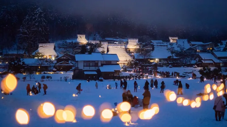 Located in the rural town of Miyama, Kayabuki no Sato is a preserved village known for its traditional thatched-roof farmhouses. When it snows, the village looks like a scene from an old Japanese folktale. The atmosphere becomes even more magical during the winter lantern festival, where snow sculptures and LED lanterns light up the night, creating a warm, nostalgic glow.
