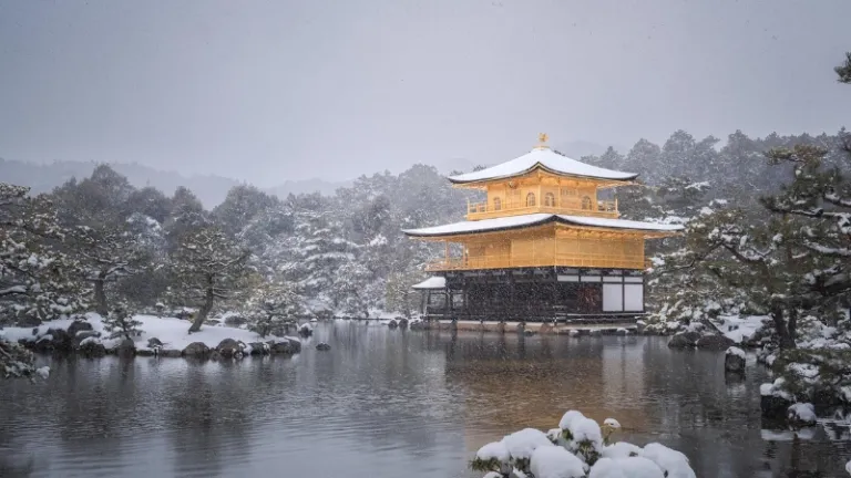 Kinkakuji (The Golden Pavilion) is perhaps the most visually stunning winter spot in Kyoto. The top two floors are completely covered in gold leaf, which shines brilliantly against the stark white snow and the reflection in the Mirror Pond (Kyoko-chi). It is a picture-perfect moment that captures the essence of Japanese aesthetics.