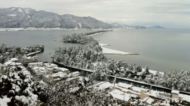 Amanohashidate is a scenic sandbar covered in pine trees that spans across Miyazu Bay. It is ranked as one of Japan's three most scenic views. In winter, the pine trees are dusted with snow, creating a beautiful white line cutting across the blue waters. To get the best view, take the chairlift or monorail to the observation deck at Kasamatsu Park.