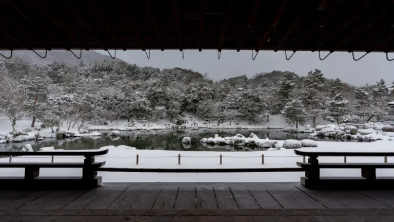 Located in Arashiyama, Tenryuji is a UNESCO World Heritage site famous for its magnificent landscape garden. The garden features a large pond that reflects the surrounding mountains. In winter, the borrowed scenery of the snowy Arashiyama mountains creates a tranquil, monochrome masterpiece that attracts nature lovers from around the world.