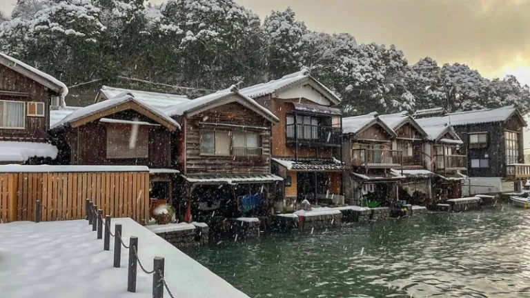 For a unique, off-the-beaten-path experience, visit Ine no Funaya. This historic fishing village is famous for its boat houses (funaya) that are built right on the water's edge, with garages for boats on the first floor. In winter, the quiet bay and snow-capped roofs create a peaceful, nostalgic atmosphere often compared to scenes from Studio Ghibli films.
